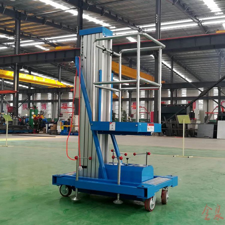 8、鋁合金升降機(jī)的使用條件,本產(chǎn)品適用于在室內(nèi)或室外無(wú)風(fēng)(或微風(fēng))條件下使用,風(fēng)力在三級(jí)以上時(shí)不能使用;五米以上平臺(tái)應(yīng)系安全繩,確保安全。使用溫度—20℃——+40℃之間,在0℃以下工作時(shí)應(yīng)使用相應(yīng)牌號(hào)的液壓油;本產(chǎn)品應(yīng)在無(wú)強(qiáng)震源的環(huán)境中使用;本產(chǎn)品適應(yīng)在堅(jiān)實(shí)平坦的地面上使用。