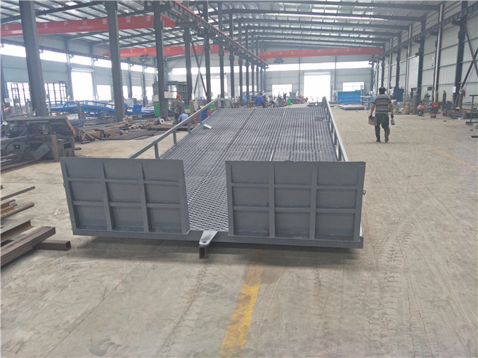 6.將移動(dòng)式登車橋兩側(cè)尾板放下,使登車橋呈斜坡狀,連接地面與貨車