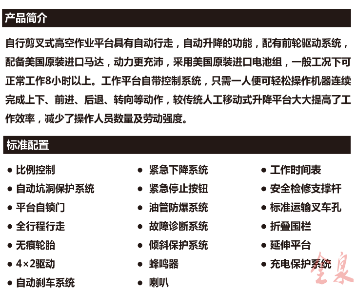 全自行剪叉式升降平臺具有自動行走功能整機一體式設計,內(nèi)置電瓶電源,滿足在不同工作狀態(tài)下,無需外接電源,不需外來動力即可升降自如,而設備的行走轉(zhuǎn)向也只需一人便可完成。操作人員只需掌握好設備的控制操作手柄即可完成設備的前進、后退、轉(zhuǎn)向、快慢速行走和上升下降等動作。